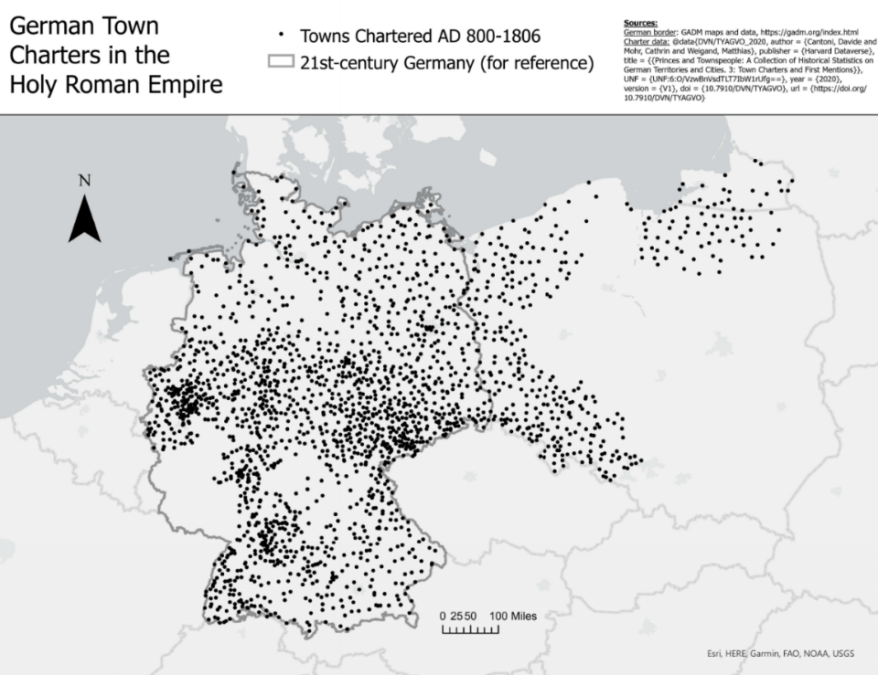 [6] Cantoni, Mohr, and Weigand, “Princes and Townspeople: A Collection of Historical Statistics on German Territories and Cities. 3: Town Charters and First Mentions.” 2-3
