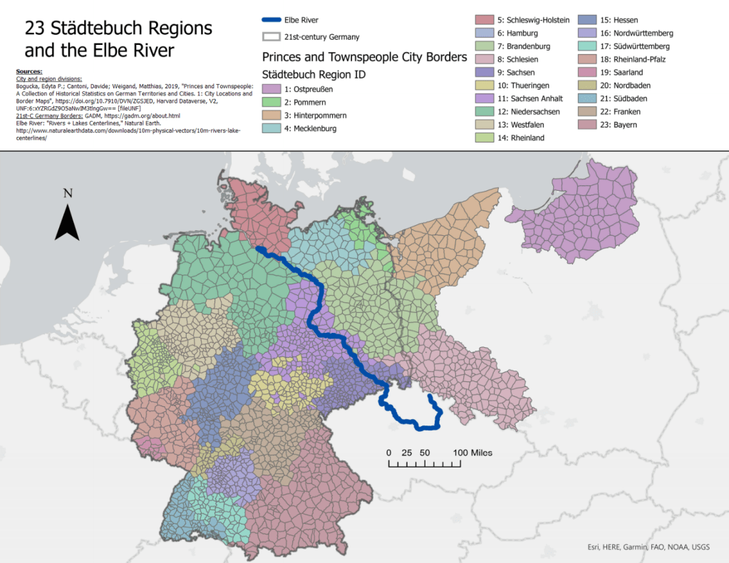 [15] Edyta Bogucka, Davide Cantoni, and Matthias Weigand, “Princes and Townspeople: A Collection of Historical Statistics on German Territories and Cities. 1: City Locations and Border Maps” (Harvard Dataverse, 2019), https://dataverse.harvard.edu/dataset.xhtml?persistentId=doi:10.7910/DVN/ZGSJED. I take these region categories from the 23 regions categorized in the Städtebuch, outlined by the University of Munich authors