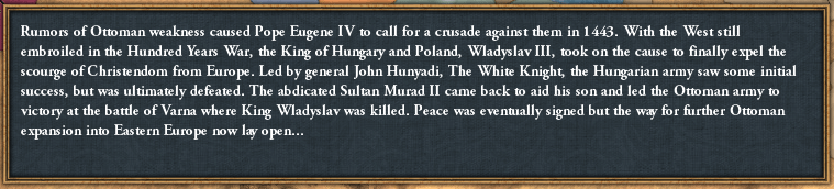 This text mentions the Hundred Years’ War, it is worth noting, but only in the context of the Varna Crusade, to explain why western Europe could not field armies for the fight against the Ottomans. This text situates the player at a particularly exciting moment in European history, foreshadowing the potential aggression of the terrible Turk into the European center but leaving the narrative open enough to excite the player to try and reverse that course where real Europeans in real history failed. The final sentence particularly leaves the reader wondering what could happen next? Drawing the player in to the feeling of threat at the hands of the Ottomans, tantalizing the player, saying the way for further Ottoman expansion lies open, what are you going to do about it?