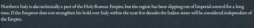 It is no coincidence that Holy Roman empire defines the whole environment of Europe in Europa Universalis IV, from the eastern Baltic to the western Mediterranean. As the temporal arm of Christendom, the Holy Roman Empire drew in polities from all across Europe, and designed to expand outward to hold all of Europe within its embrace.