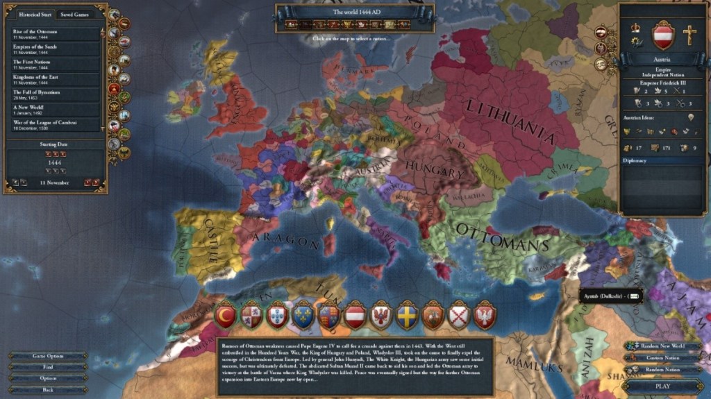 The game also provides a brief text (seen in Figure 2) describing the geopolitical environment of the Varna Crusade before the player even chooses a nation. Once the game begins, the player will progress through a great deal more historical “flavor” text and descriptions of the specific country they chose, but this text on the Varna Crusade will always be the first piece of historical writing that a player encounters upon entering Europa Universalis: